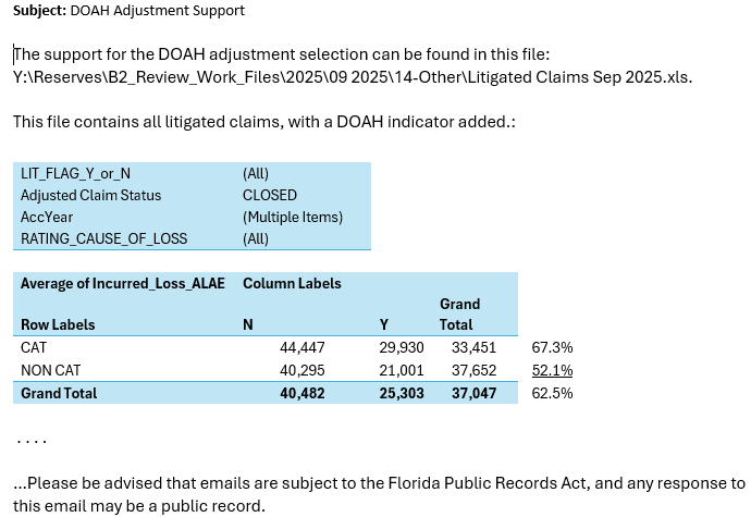 That’s not evidence that policyholders are being helped. Instead, it’s evidence that Citizens is saving money by steering disputed claims into a process it created and controls. It is also evidence that the Citizens claims executives are merely building a business model case for DOAH’s use. The insurer’s internal records even referred to this analysis as “support for the DOAH adjustment selection.” This is a telling phrase that frames DOAH not as a fairness initiative but as a cost-reduction tool to save Citizens money rather than take care of its policyholders through full and prompt payment.
