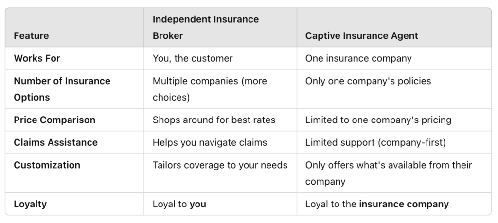 Think of an independent insurance Broker as your personal insurance shopper. Unlike agents who work for just one company, independent Brokers can look at many different insurance companies to find your best deal. We work for you, not the insurance company!