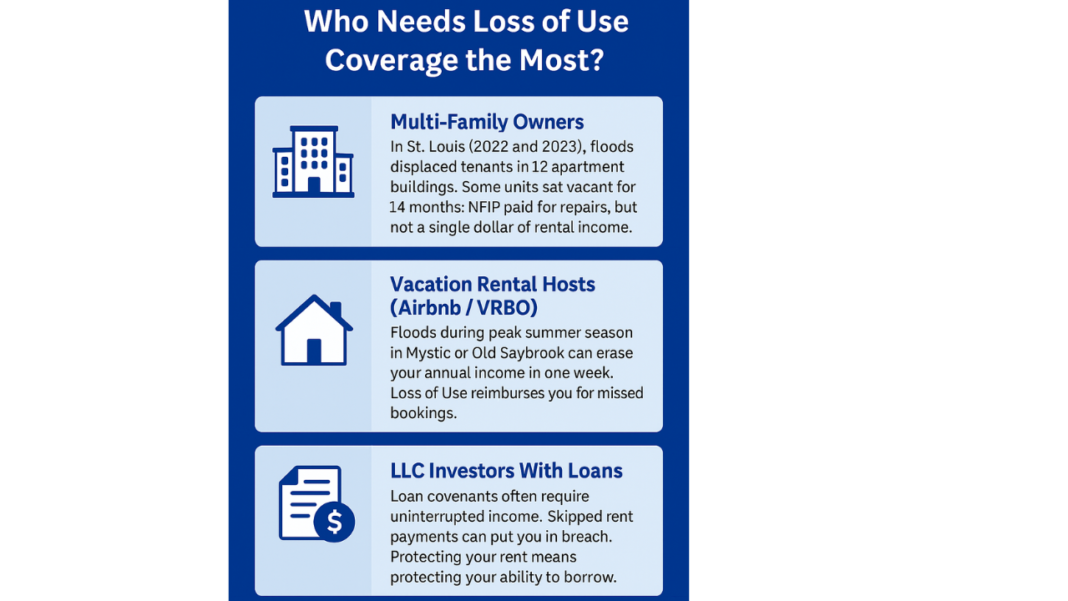 NFIP will help cover structural damage, but you receive nothing for the four months of missed rent. That’s a direct hit to your bottom line.