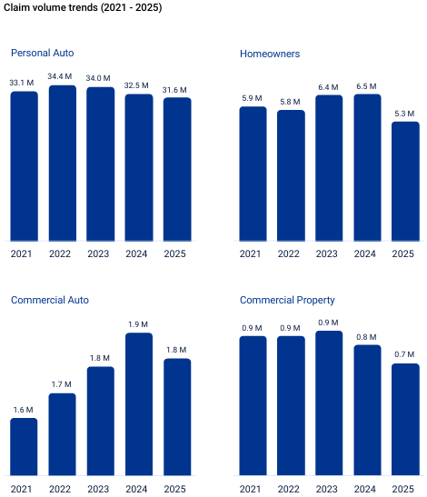 Commercial property saw 710,000 claims in 2025, down from 910,000 in 2023. Commercial auto claims volume fell to 1.8 million in 2025, down 5% from the prior year.