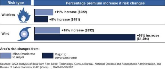 A new report from the Government Accountability Office finds that average premium increases between risk levels are larger for wind than for wildfire.